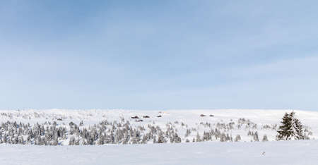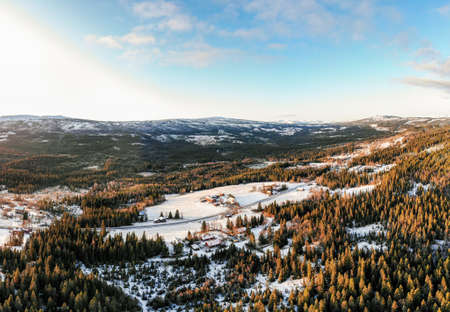 Beautiful landscape panorama of Norway FÃ¥vang Kvitfjell Ski area with Mountains cottages cabins huts and cloudy sky.
