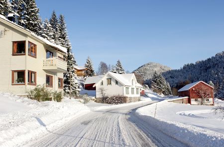 Astonishing outdoor view of traditional Norwegian mountain red houses of wood covered with snow in the roof in stunning nature mountain background in Norway