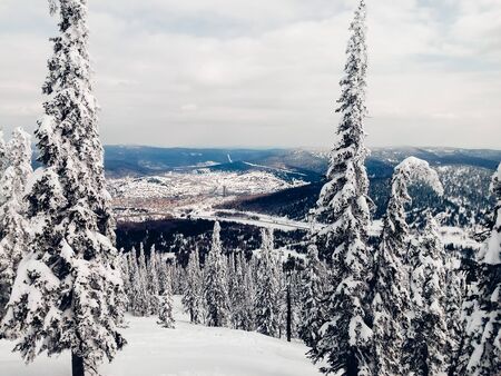 Snowcat tracks on a ridge covered with fir trees in Sheregesh in winter