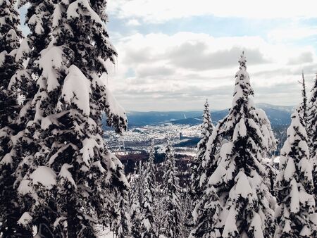 Landscape with mountains, river and buildings in Lillehammer town, Norway.