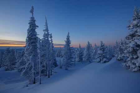 Sheregesh. Dawn on Mount Zelenaya, the winter nature of Siberia, Russia