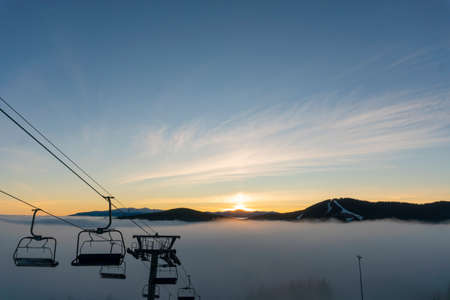 Chair Lift for Skiers Moving on the Mountain Top at Sunset time and Foggy Day in Bukovel Ski Resort, Carpathians, Ukraine