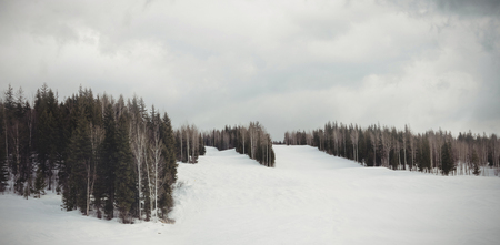 winter mountains with clouds in sunset time. Ski slope, pine tree forest, mount range in the background. Majestic nature landscape. Ski Resort Bukovel, Carpathian Mountains, Ukraine.
