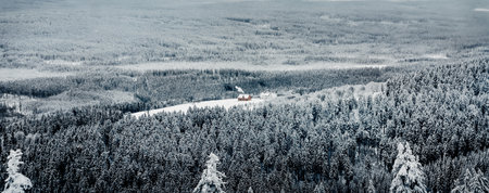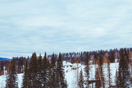 A beautiful winter view with a small house on the mountain surrounded by fir trees