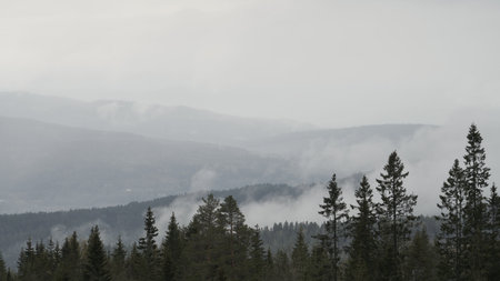 Czarna Gora viewpoint, the fog passes through the valley between the mountain peaks. View from the vantage point, dense forest covers the hills.