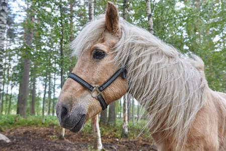 Head horse in a Finland forest landscape. Animal. Horizontal