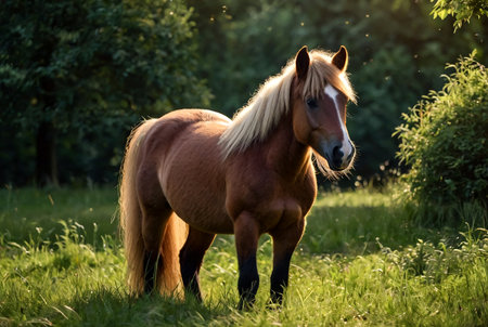 Pony Grazing Peacefully in Forest Clearing, summer daytime. Small horse pony with lush mane eats grass in serene forest setting, outdoors. Pet horse animals concept. Copy ad text space