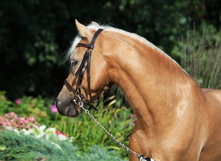 Equestrian sport. Portrait sports red stallion in the bridle. Dressage of horses