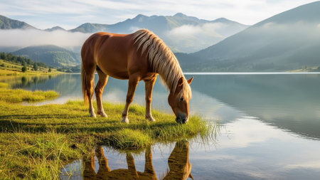 A brown horse grazes peacefully near a calm lake, with a mountain range providing a serene backdrop. The image features natural lighting and a balanced composition, with the horse reflected in the water. This scene could be used for various commercial projects and editorial content.