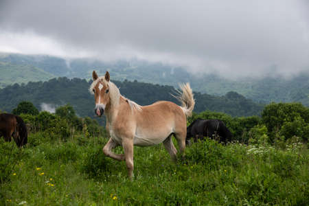 beautiful and nice horse, with a blond mane and gold color and long ears, grazes the grass in the high mountains