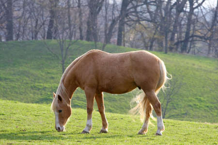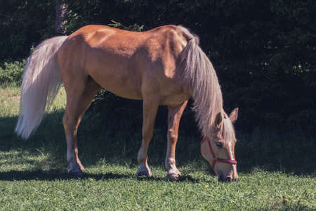 A flaxen horse grazing in the beautiful field meadows. A light brown horse with a blonde mane eating grass on the horse farm. Lush greenery in the background. Scene from the horse farm.