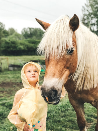 Young child in a raincoat gazes lovingly at a horse in a lush meadow. The child's expression of wonder complements the peaceful ambiance of the pastoral environment.