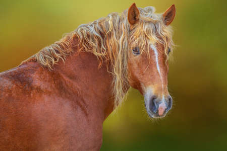 Beautiful chestnut horse with white stripes and long mane looks in camera leaning on another horses back in sunny summer meadow on blurred green trees background. Intelligence and loyalty concept.