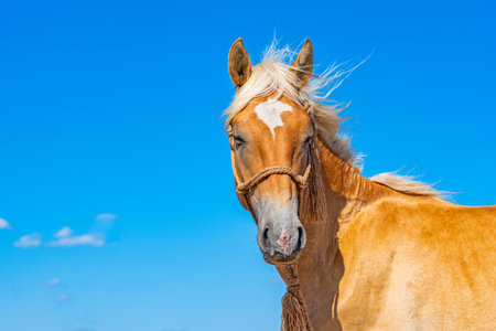 horses mane close-up. The horses neck. The peach color of the coat. Background blue sky. horizontal photo