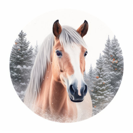 the white horse stands gracefully on a snowy scene, captured in a realistic animal portrait style. the light brown and orange hues add charm to the character illustration, which is presented in a tondo format. shot on 70mm, this illustration is perfect for wimmelbilder enthusiasts. ai generated