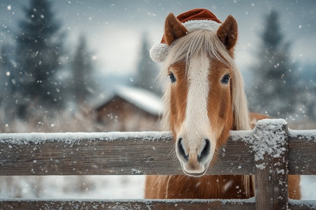 Festive Horse Joyfully Peeking Over Snow-Covered Fence Dressed for Christmas in Winter Wonderland