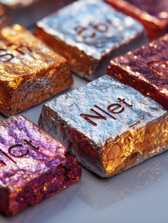 Metallic blocks in vibrant colors are arranged on a surface, each engraved with different element symbols, capturing the afternoon light beautifully.