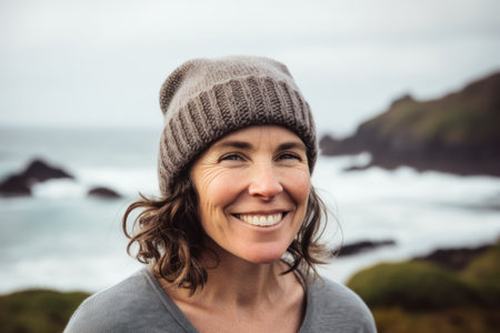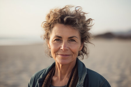 Portrait of a beautiful middle aged woman with curly hair at the beach
