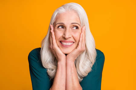 Closeup photo of pretty cheerful white haired grandma aged lady overjoyed arms on cheeks affectionate look side empty space wear green shirt isolated vibrant yellow color background