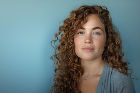 A woman with curly hair is smiling and wearing a necklace. The necklace is silver and has a pendant. The woman is standing in front of a blue wall