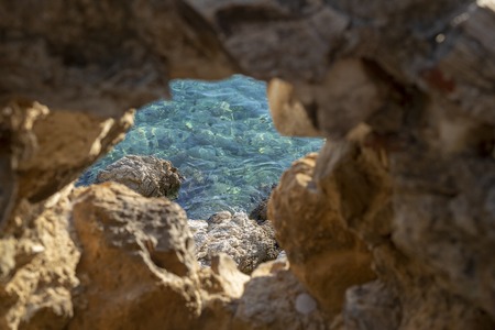 Waves of the Mediterranean sea break against a rock on Paphos beach in Cyprus