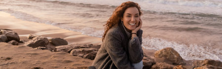 Cheerful young woman looking away while sitting on beach during sunset, banner