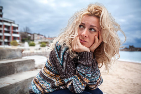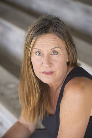 Portrait attractive mature woman sitting alone and lonely, sad thoughtful facial expression, upward look, blurred background.