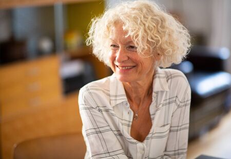 Portrait of a smiling middle aged woman with curly blonde hair on the beach