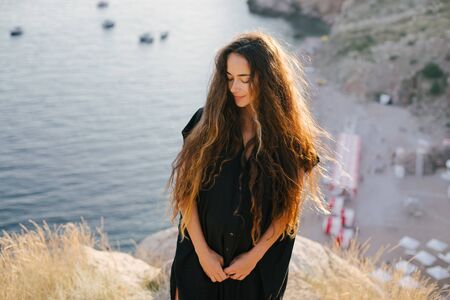 Portrait of a woman in a black dress outdoors on a meadow in the mountains