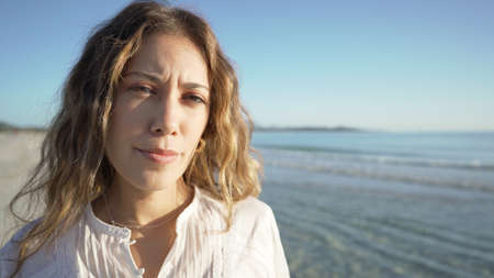 Face close-up of young cute Caucasian blonde woman looking at the camera at sunset or dawn in the seashore with a stylish white shirt - Real people confident expression