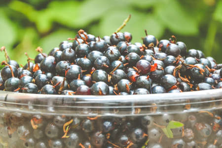 Currant berries. Black currant harvest. Organic berry in the countryside. Retro style photo. Ecologically clean agriculture. Fresh berries ready for canning.