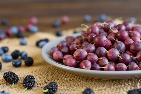 Berry mix of gooseberry and blackberry agrus on a white plate on a wooden background. A plate with berries in the center of the table. View from above.