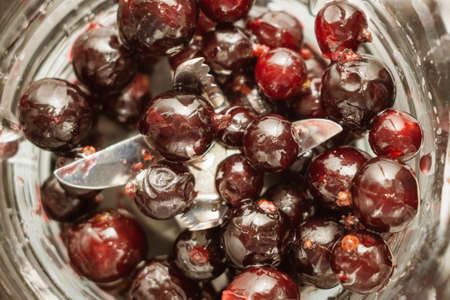 Fresh organic marasca sour cherry on happy sunny market, selective focus