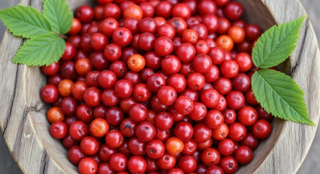 Red ripe berries of a cowberry (lingonberry, Vaccinium vitis-idaea, partridgeberry) with green leaves. Vitamin product for a healthy diet. Top view.