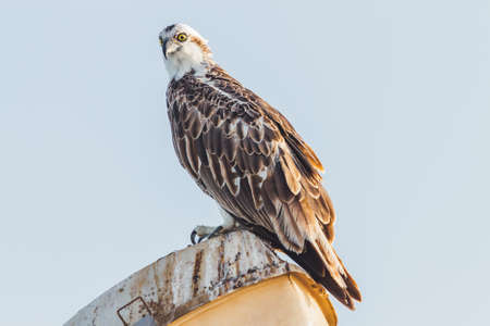 Falcon sits on street lantern on clear blue background. Big bird staring in camera. Sunny day in Hurghada, Egypt.