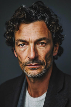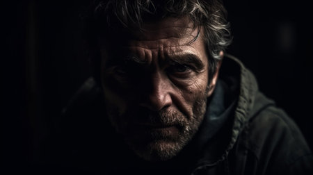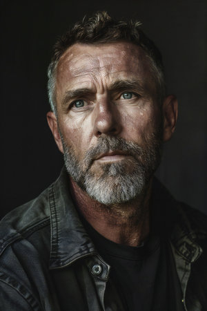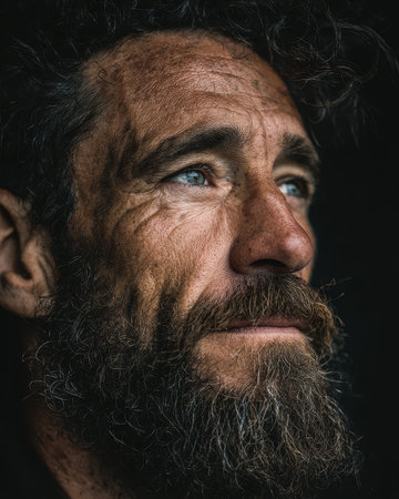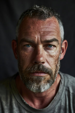 A man stares intensely at the viewer, his strong facial features accentuated by a thick beard and striking blue eyes. The backdrop is plain, enhancing the dramatic tension of his fierce expression, revealing deep emotions.