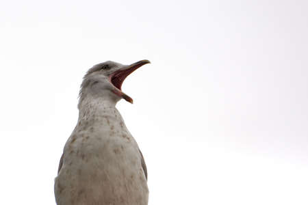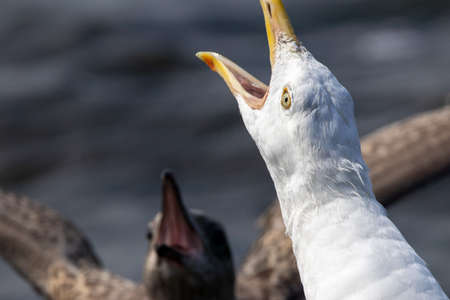 An adult herring gull and a juvenile herring gull screaming at each other.