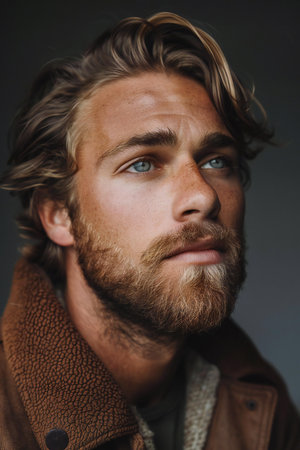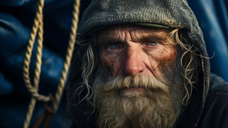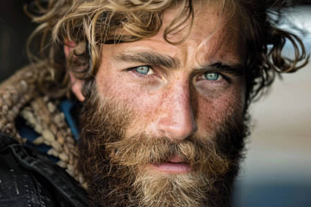A detailed view of a man with a beard, rugged features, and piercing blue eyes, A man with a rugged beard and tousled hair