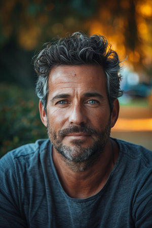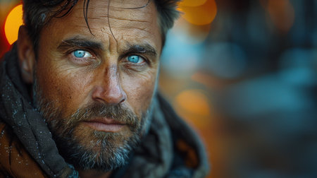 A rugged individual with piercing blue eyes stands in a lively city at dusk.