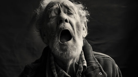 Monochrome portrait of an elderly man with an open mouth, possibly depicting a moment of realization or confusion, potentially related to cognitive conditions.