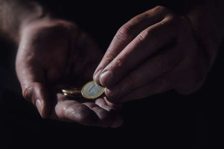 Man hands holding euro money on a black background, close-up. European cash in the dirty hands of a poor man on a dark background