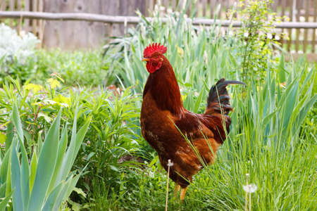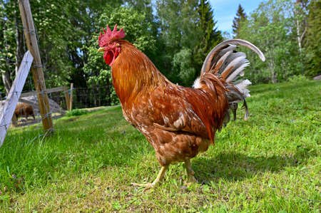 Beautiful red cock on green grass, rustic nature on farm