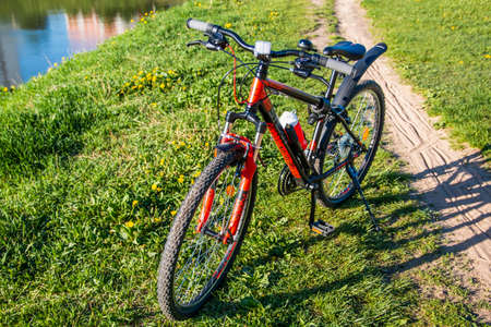 A sports bicycle on a green grass near a city lake