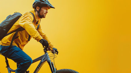 A side view of a mountain biker wearing a helmet, riding on a yellow background.