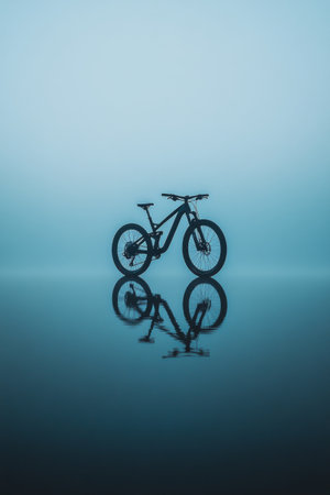 A mountain bike stands by the edge of a calm lake, its reflection visible in the misty water under the early morning fog. Surrounding trees fade into the background.