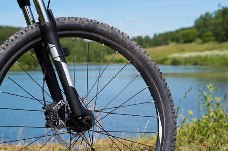 Close-up of bicycle with large wheels in countryside. Mountain bike stands on ground in sunny weather
