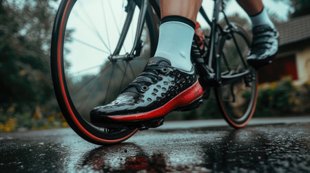 A close-up shot of a cyclist's shoe in action on a wet road, capturing the essence of sport and movement in an outdoor environment.