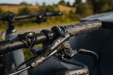 Asturias, Spain - August 8th, 2020: Close up of mountain bike brake lever, Shimano XT, placed on a car bike rake, with nature in the background.