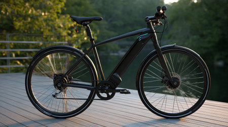 Black bicycle on a wooden pier in the rays of the setting sun