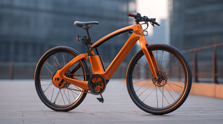 Modern orange bicycle on the city street in the evening. Side view.